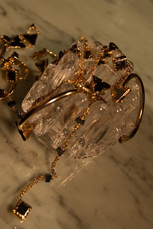 Cada pieza de TRIAD está hecha delicadamente a mano en bronce con baño de oro, e incorpora una sola gema: la acerina, de tono oscuro y energía magnética asociada a la fortaleza y la protección.