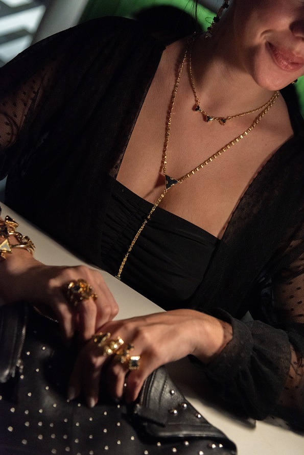 Cada pieza de TRIAD está hecha delicadamente a mano en bronce con baño de oro, e incorpora una sola gema: la acerina, de tono oscuro y energía magnética asociada a la fortaleza y la protección.