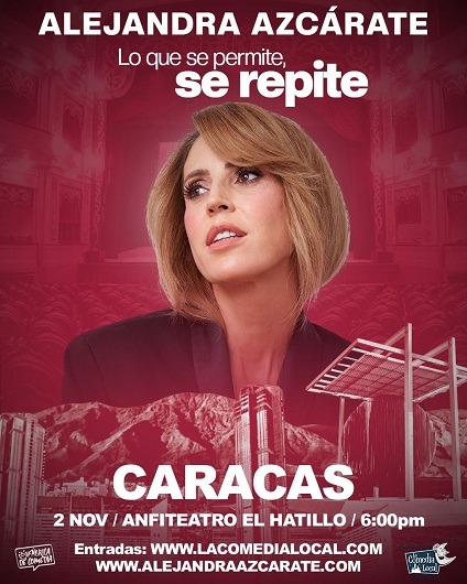 El próximo 2 de noviembre a las 6pm, la comediante colombiana Alejandra Azcárate presentará en el anfiteatro El Hatillo “Lo que se permite se repite“, su monólogo más personal y sarcástico, como parte de una extensa gira que realiza por Europa y Latinoamérica.