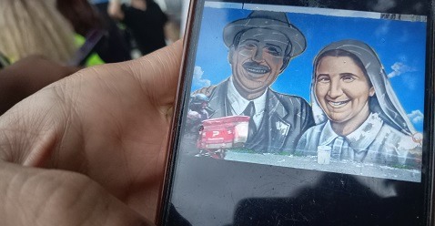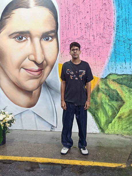 Albornoz @dial.ink es un joven que no para de crear, así lo evidencian sus palabras bajo la profusa lluvia minutos antes de empezar el acto: » de aquí me voy para la Av Panteón, detrás del Ministerio de Educación, para continuar con el mural que estoy haciendo» y desde su teléfono celular muestra la foto del boceto de los Santos José Gregorio Hernández y Carmen Rendiles abrazados.