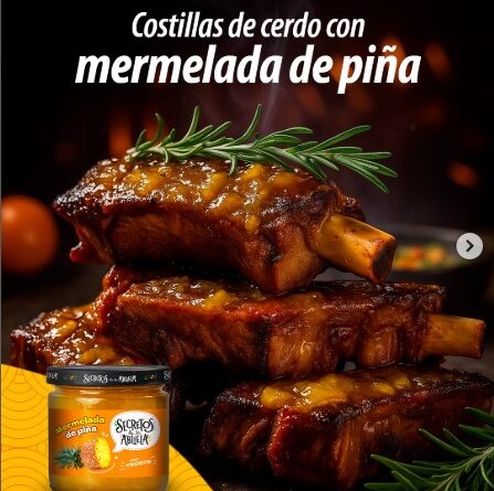 La combinación de la carne de cerdo con la dulzura y acidez de la piña es un clásico que nunca falla. La mermelada, elaborada con piñas frescas seleccionadas, que conserva trocitos de la fruta, no solo aporta un sabor tropical, sino que también crea un glaseado perfecto que carameliza las costillas al hornearlas, sellando todos los jugos y creando una capa irresistiblemente deliciosa.