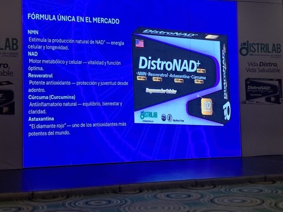 El nuevo integrante de la línea Distro de la compañía Distrilab viene a revolucionar el mercado venezolano ya que su fórmula, combina NAD, NMN, cúrcuma, resveratrol y astaxantina, que actúa como antioxidante celular, antienvejecimiento, antiinflamatorio y bioenergético.