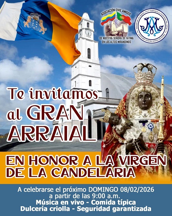 El Arraial en honor a la Virgen de la Candelaria comenzará a las 9:30 am con la tradicional misa presidida por el padre Henry Rivero , seguidamente se realizará la procesión de la Virgen de la Candelaria por las instalaciones del Santuario y se dará comienzo al Arraial con la venta de comida típica de Portugal, dulceria criolla y música en vivo a cargo de la agrupación folclórica portuguesa, Rondalla Hogar Canario, Rondalla Timanfaya Canaria, The Newman, Euler «El de las 1.000 voces», «Ey soy gaitero y algo más» y Karina Contreras «La llanera».