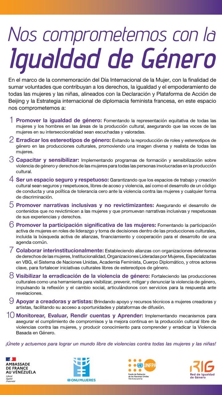 Durante los 16 días de activismo, se procederá a la instalación del decálogo en cada una de las instituciones culturales aliadas, asentando de esta forma públicamente el compromiso del mundo cultural, de la Embajada de Francia en Venezuela, UNFPA y ONU Mujeres contra la violencia de género.
