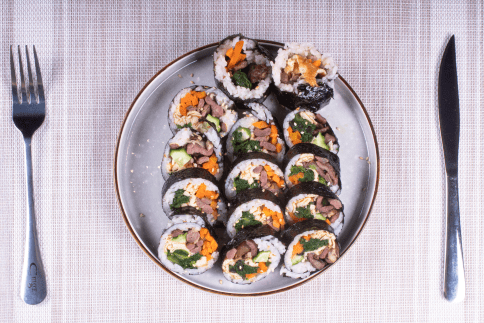 • Kimbap, el famoso roll coreano envuelto en alga, relleno de arroz, vegetales y proteína, ideal para compartir.