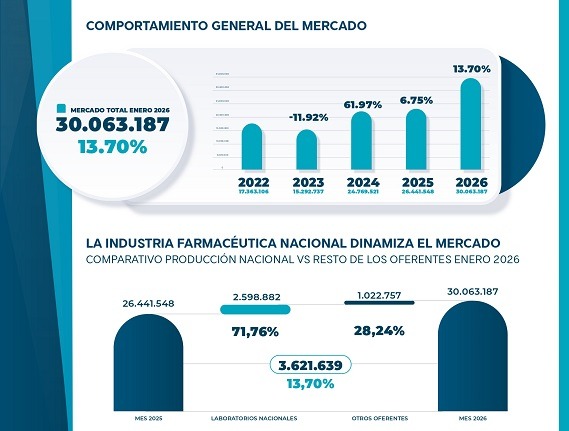 La manufactura nacional se ratifica como el pilar fundamental del sector. Durante enero, los laboratorios nacionales fueron responsables del 72% del aporte al crecimiento del mercado. En el segmento de genéricos, la producción local representa el 70,27% del crecimiento del rubro.