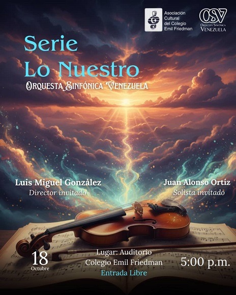 La Orquesta Sinfónica Venezuela continúa celebrando su 95 aniversario, y se complace en presentar el inicio de su segunda temporada artística con un concierto excepcional titulado «Serie Lo Nuestro». Este evento tendrá lugar el próximo sábado 18 de octubre a las 5:00 pm en el auditorio del Colegio Emil Friedman con entrada libre, bajo la batuta del reconocido violinista, docente y director de orquesta, el maestro Luis Miguel González, y con la participación del joven solista Juan Alonso Ortiz, talentoso estudiante del CEF de tan sólo 14 años de edad.