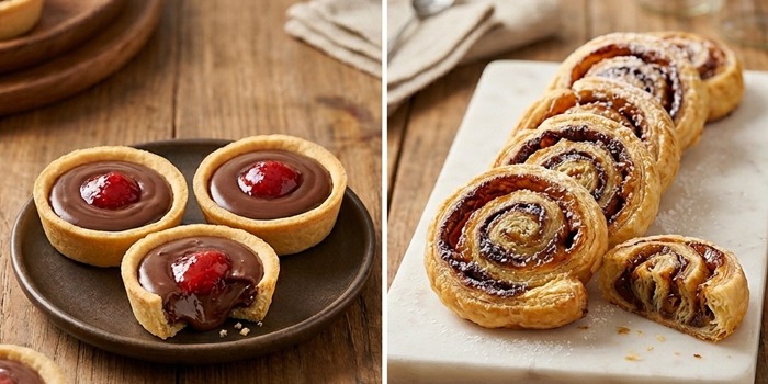 - Preparar pequeños bocaditos (pueden ser tartaletas de masa quebrada o incluso pan de leche tostado) rellenos con el chocolate untable.