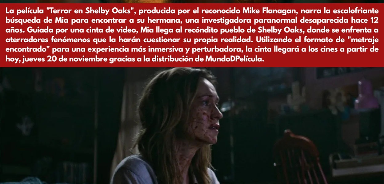 Una poderosa presencia maligna se apodera de la gran pantalla con Terror en Shelby Oaks, una historia paralizante y estremecedora que gira en torno a Mia, quien busca con osadía a su hermana Riley, miembro de un grupo de investigadores paranormales que desapareció de la nada hace 12 años. Al ser testigo de una extraña tragedia, Mia encuentra una última cinta grabada por el equipo de su hermana, es allí cuando se adentra a una oscura travesía dentro del recóndito pueblo de Shelby Oaks, el cual le revela fenómenos incomprensibles y la obligan a cuestionar la realidad enfrentándose a sus propios miedos. Este largometraje promete adentrar a los venezolanos en un contexto aterrador que desafiará la valentía de los más fuertes en los cines del país, gracias a la distribución de MundoDPelícula.