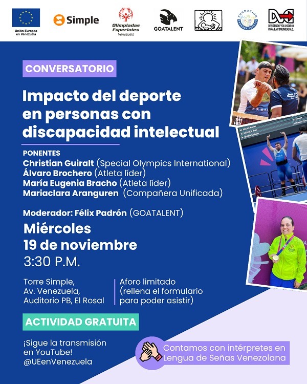 El miércoles 19 de noviembre inicia esta programación con el conversatorio titulado Impacto del deporte en personas con discapacidad intelectual. Tendrá lugar a las 3:30 pm en la Torre Simple, en El Rosal. En la organización de esta actividad destaca el apoyo de Olimpiadas Especiales Venezuela, así como la participacion de Christian Guirault, de Special Olympics International; de diferentes atletas, y la moderación de Félix Padrón, CEO de GOATALENT y Gerente Deportivo Internacional CIES-FIFA.