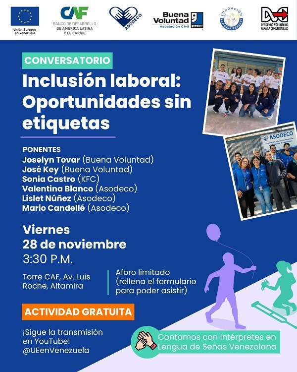 El viernes 28 de noviembre será el conversatorio titulado Inclusión laboral: Oportunidades sin etiquetas. Se realizará en la Torre CAF, en Altamira, también a las 3:30 pm. En esta ocasión se contará con la participación de las organizaciones ASODECO y Buena Voluntad, así como diferentes beneficiarios y la Gerente de Recursos Humanos de KFC. Será una oportunidad para conocer experiencias de éxito sobre el proceso de integración laboral en este tipo de población.